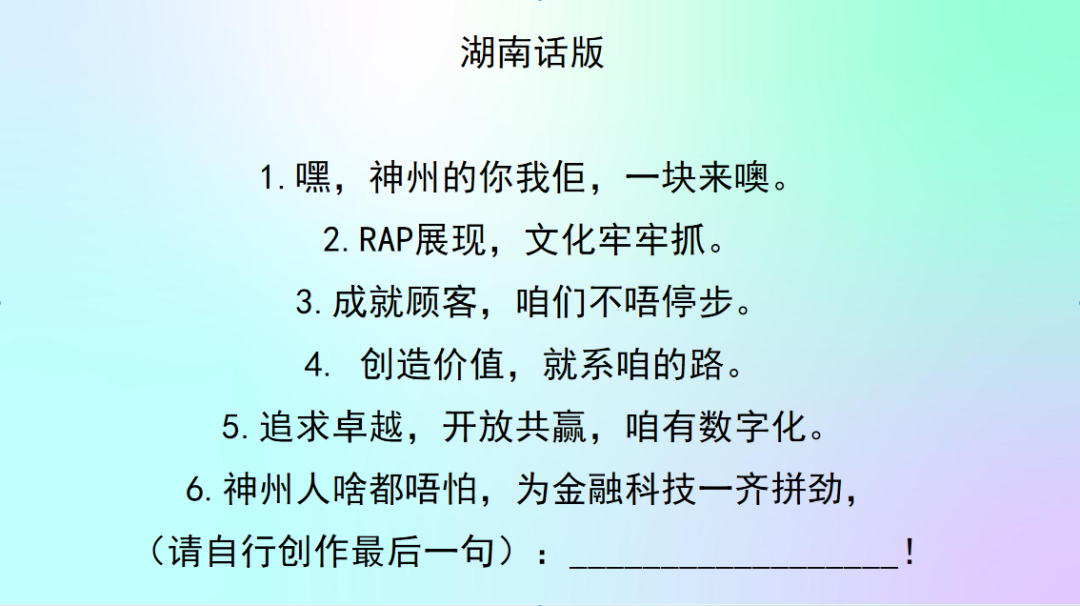 你对BB贝博艾弗森官网的新文化价值观熟悉吗?来来来,欢迎来参加神州Rapper挑战赛!让我们用最嗨皮的方式说出我们对BB贝博艾弗森官网新文化的理解。速度为王,又快又好!
