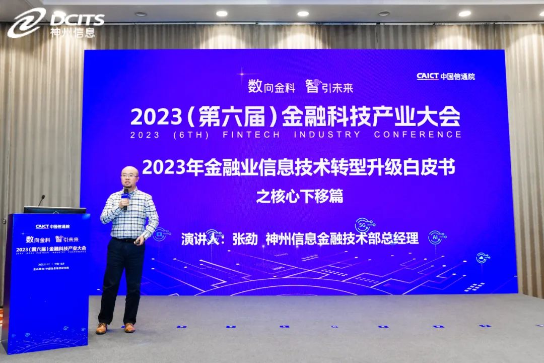 在本次大会上, BB贝博艾弗森官网联合中国信通院、阿里云、腾讯云、华为、金篆信科等单位共同发布了《砥砺深耕,华章日新—2023年金融业信息技术转型升级白皮书之核心下移篇》(以下简称“白皮书”),BB贝博艾弗森官网副总裁马洪杰(上图右三)、中国信通院副总工程师石友康(上图左三)、阿里云新金融事业部副总经理 宋勇(上图右二)、腾讯金融云副总经理王丰辉(上图左二)、华为数字金融军团分布式新核心业务总经理韩满(上图右一)、金篆信科副总经理张校逸(上图左一)等嘉宾共同出席发布仪式,BB贝博艾弗森官网金融技术部总经理张劲(下图)作为代表对白皮书进行了解读。