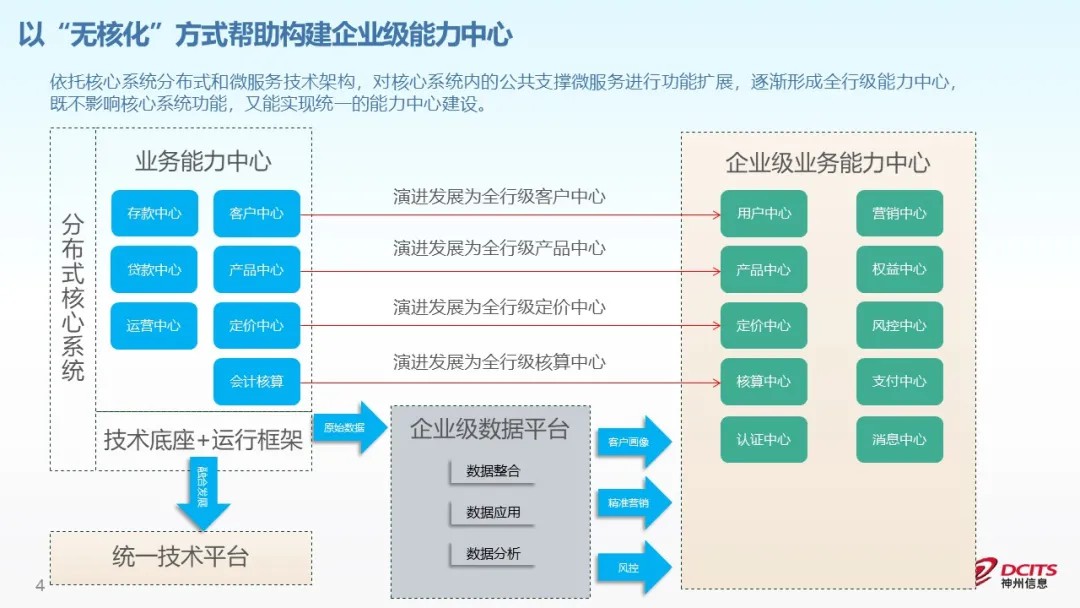 构建企业级的全行能力中心,已经成为核心下移或者新核心建设的一种趋势。依托核心系统分布式和微服务技术架构,对核心系统内的公共支撑微服务进行功能扩展,逐渐形成全行级能力中心,既不影响核心系统功能,又能实现统一的能力中心建设。从功能中心到能力中心,带来两方面的改变:
