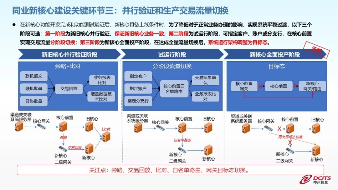 三是核心切换前的并行验证和生产交易流量切换。在新核心具备上线条件前,为降低对业务影响,实现系统平稳切换,可选择三个关键阶段进行上线前验证: